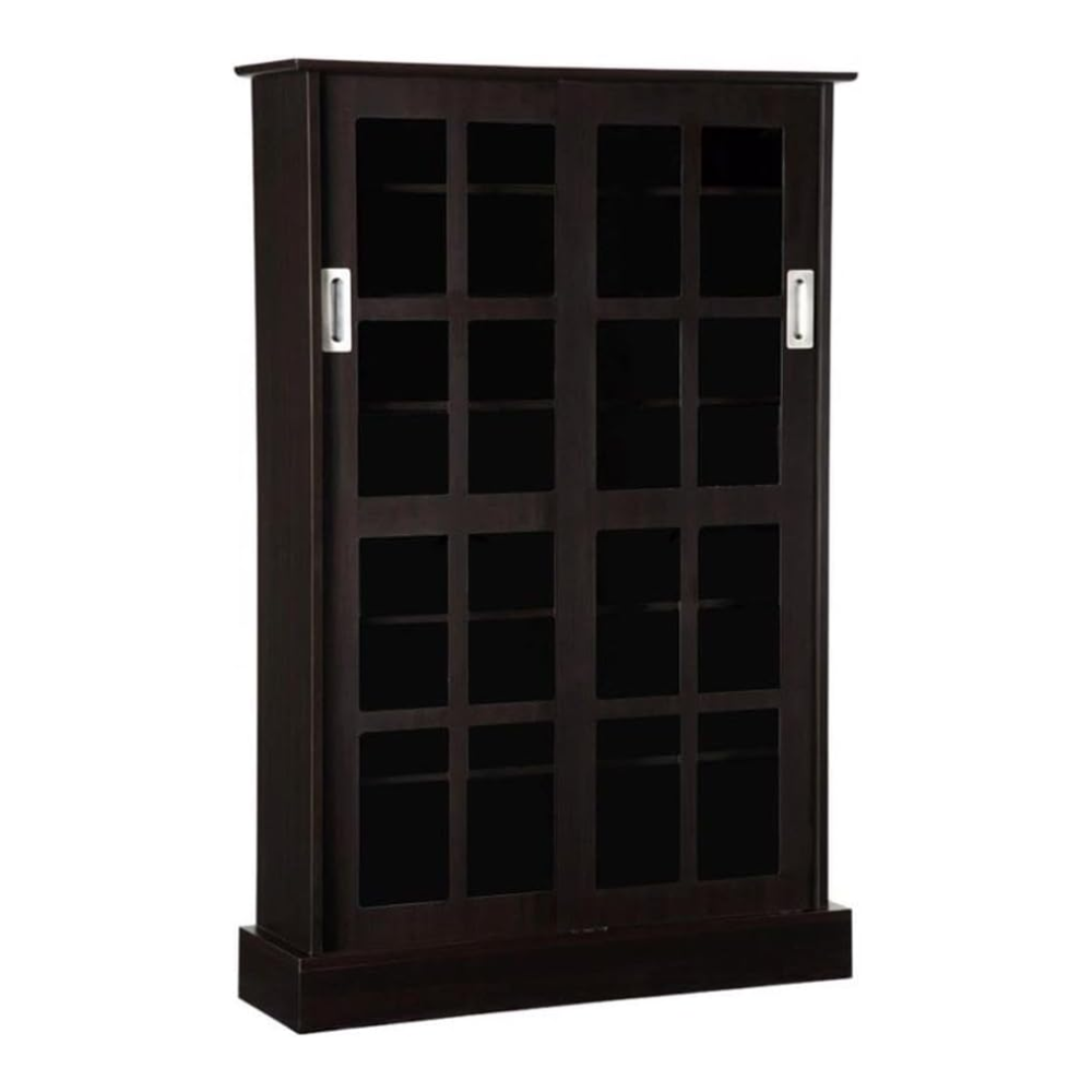 Got a media mess? Then start organizing in style with the Windowpane Espresso Media Storage with Glass Doors. Stylish and smart, this traditional media storage cabinet features two-way sliding glass doors for easy and elegant access to your entire home entertainment collection. Beautifully cut tempered glass doors and a rich espresso finish create a sense of understated luxury perfect for modern and traditional living spaces. Adjustable shelves capable of storing 576 CDs, 192 DVDs, or 216 BluRay discs provide maximum flexibility for a variety of media types. Constructed of a combination of engineered wood (a super-durable medium density fiberboard (MDF)), steel, and glass. This media storage unit sports a thick base and frame for added stability and support. So start organizing and get a hold of your media storage mess with this sophisticated media storage cabinet.