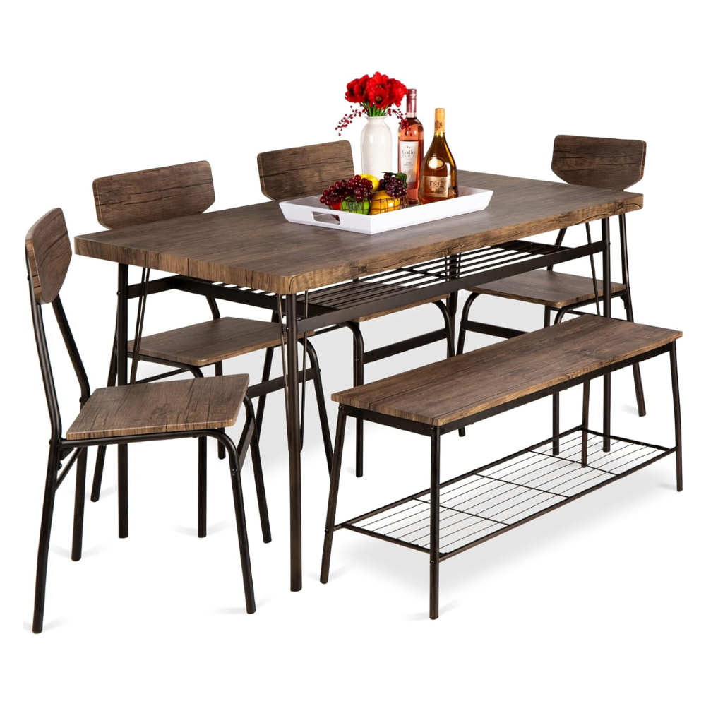 Best Choice Products 6-Piece 55in Modern Home Dining Set w/Storage Racks, Rectangular Table, Bench, 4 Chairs – Brown