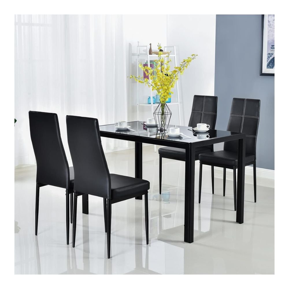 5-Piece Dining Set: The dining table set with glass top and leather chairs for 4 is a perfect addition to your dining space. Comes complete with simple and contemporary elegance.
