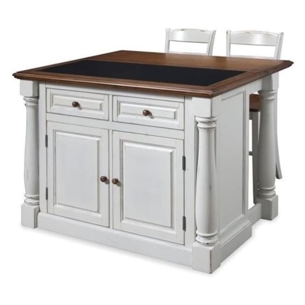 The Kitchen Island blends upscale design with state-of-the-art functionality. Stylish design features include a solid hardwood, distressed Oak finished top with profiled edges and a black granite inset; framed side and back panels; Brushed Nickel hardware; and a multi-step Black finish over hardwood solids and engineered wood. Functional elements include two storage drawers and a two-door storage cabinet with four adjustable shelves. What makes this island really unique is the hidden sliding mechanism connected to the back two shaped and turned posts. The mechanism provides easy mobility and independent movement of the two posts for expansion of the breakfast bar. Either with the breakfast bar closed or in use, this piece has a polished look by being consistently styled on both the approach and working sides. Size: 48 x 25 x 36 Size with breakfast extended: 48 x 40.5 x 36