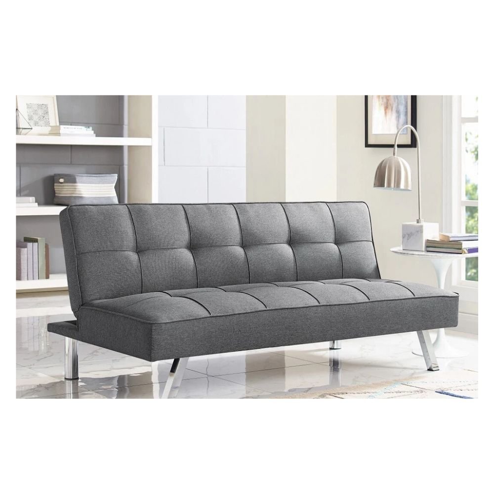 Sleek and stylish with its rounded edges, tufting and chrome legs. DHP’s Emily Convertible Futon has a modern look that is fitting for most rooms. The sofa easily adjusts from sitting, to lounging to sleeping positions and features a split back for added versatility. Upholstered in eye catching grey or navy linen the futon has a different feel from its faux-leather counterpart. The cushions are full and stay firm even after daily use, and the polyester and foam filling provides ample comfort. The versatility, modern appeal and sleek design of the Emily Split Back Futon make it perfect for any home or office space.