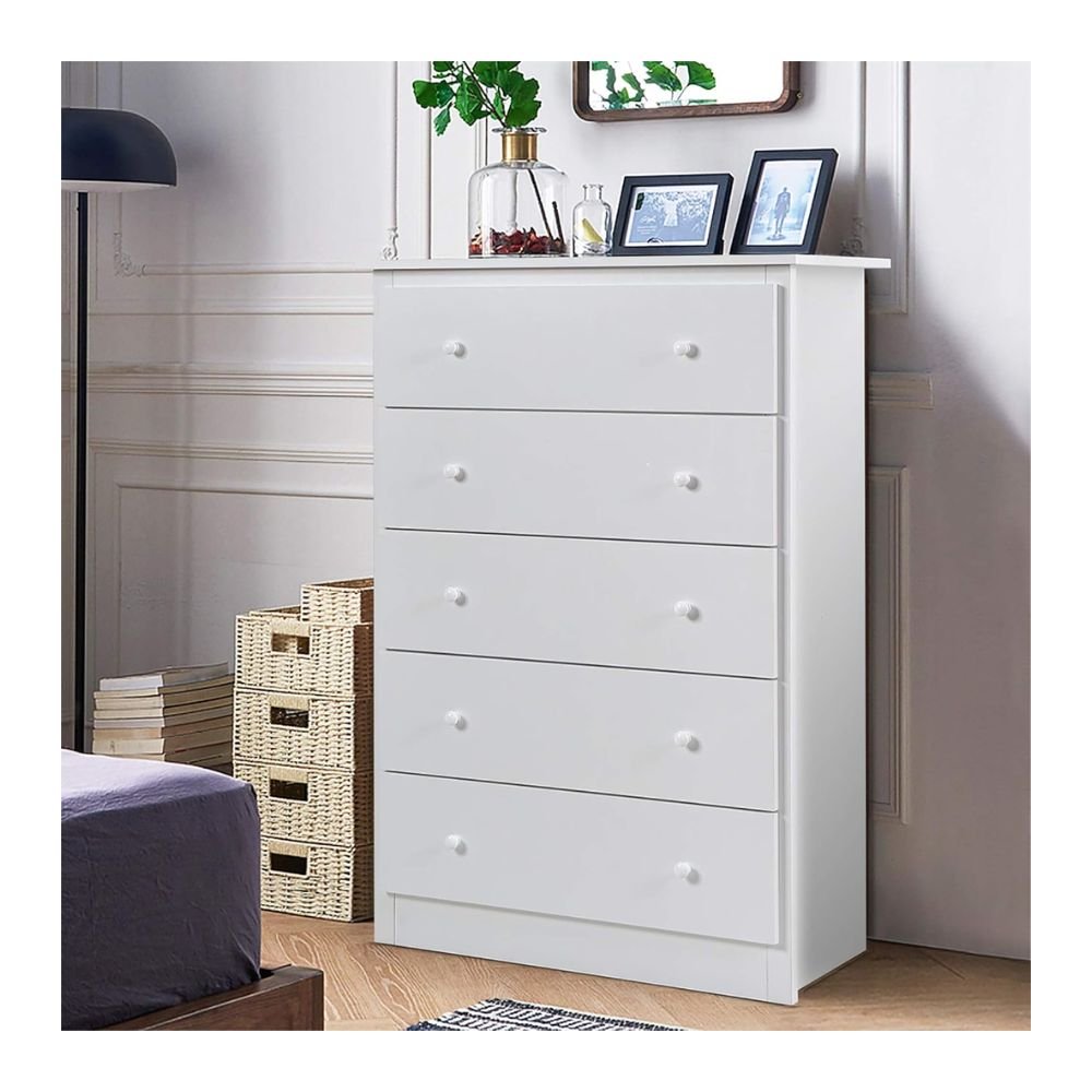 【Sturdy & Durable Construction】 This 5-drawer chest is made of high-quality PB board, which is environment-friendly and durable to support your long-term use. And its flat surface without burrs is safer to use. Thanks to its premium material, the dresser can support up to 77 lbs.
