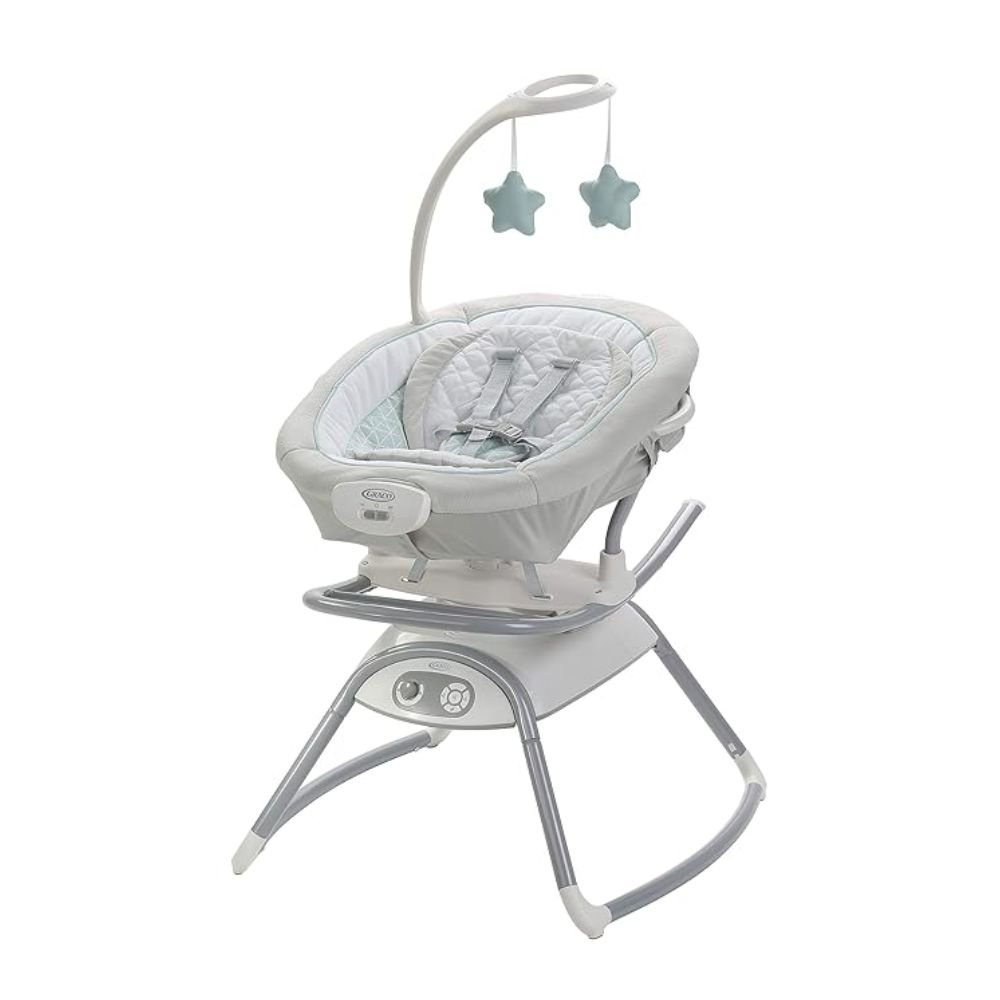 The versatile Graco® Duet Glide™ Gliding Swing with Portable Rocker is a multi-use swing that offers unique swinging and gliding motions. The swing seat conveniently doubles as a portable rocker with carry handles to keep baby happy by your side throughout the home. The swing has 4 soothing motions to choose from – baby can enjoy side-to-side or front-to-back swinging or gliding. The adjustable swing speeds allow you to find just the right pace, and the vibration with 2 speed settings ensures baby will be content. The swing also features 3 position recline, 15 songs and sounds, an adjustable toybar with 2 soft toys and an AC Adapter for added convenience. The extra-plush softgoods with removable infant body support are machine washable for easy cleaning, while the 5-point harness keeps baby cozy and secure.