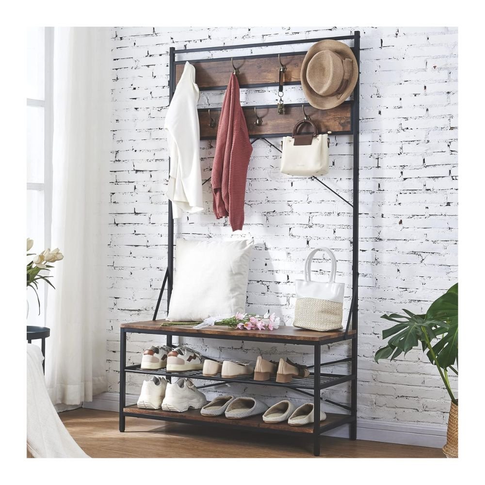 Hombazaar 3-in-1 Entryway Coat Shoe Rack, Entry Hall Tree Bench with 3 Tier Storage Shelves, Wood Furniture with Metal Frame, 7 Hooks for Garment Coats Hats Keys Umbrella Rack