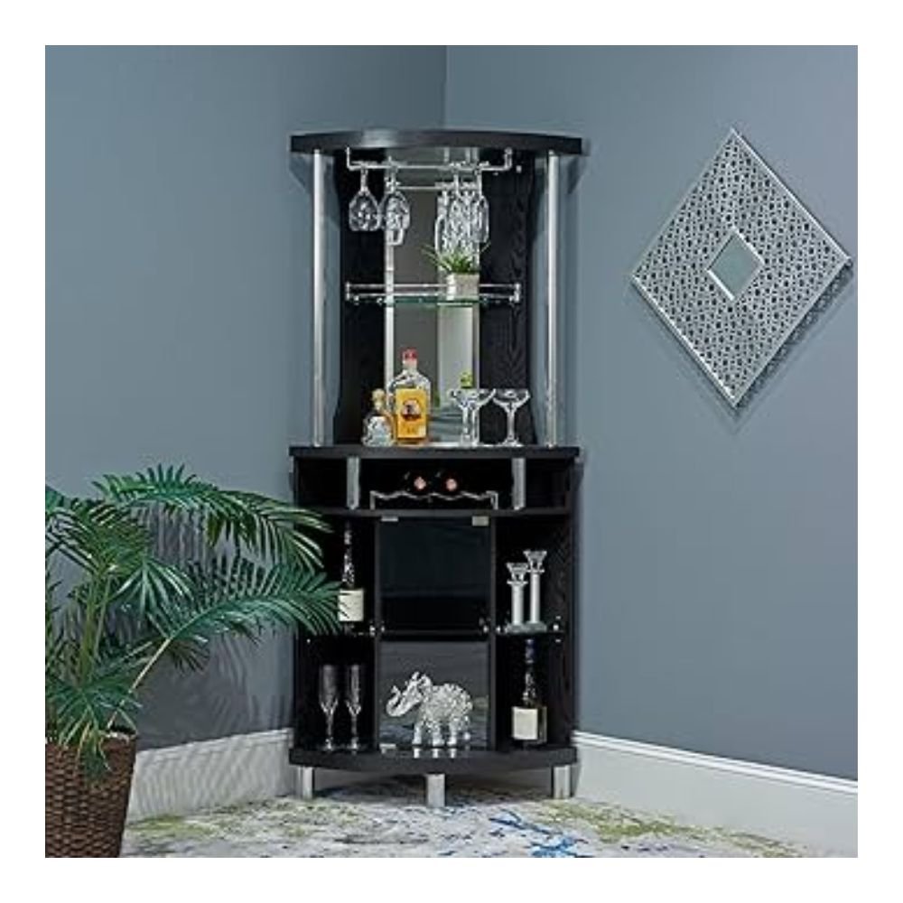 Complete your home décor with the Home Source Madeline corner bar. This fashionable piece of furniture can store a number of liquor bottles. Mirrored walls create a bar like atmosphere. Glass rack will hold four wine glass with five easy access wine bottle rack. Made with maple wood veneers in a warm mahogany finish the Home Source Madeline corner bar will be a favorite for you and your guests