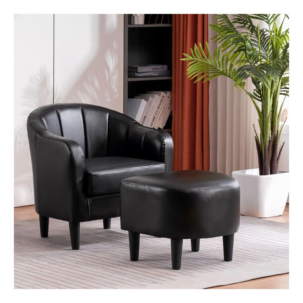 Mcombo Modern Accent Club Chair, Tub Barrel Chair with Ottoman, Faux Leather Arm Chair with Round Legs, Single Sofa Chair for Living Room Bedroom 4022 (Saddle)