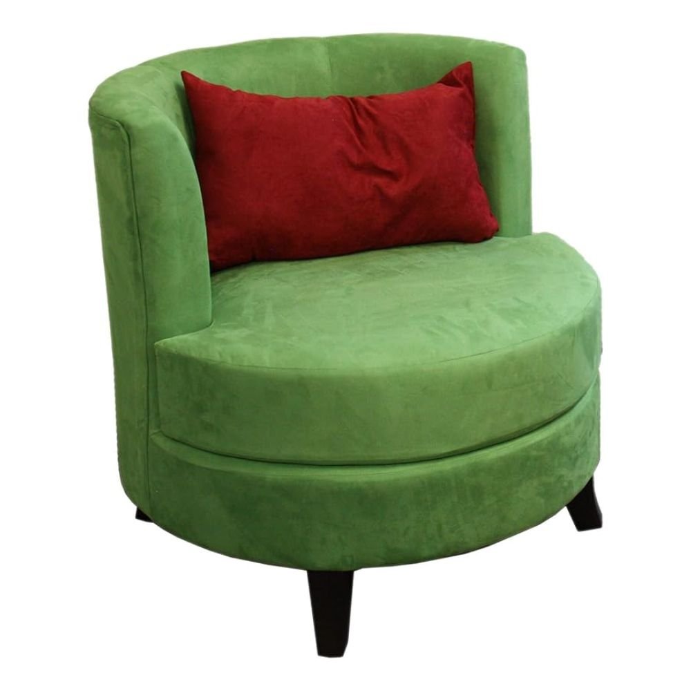 As a stand-alone piece or used to accent your living room ensemble, This Green Leaf shape Accent Chair will bring optimal comfort and exceptional style to your room. The Ore International HB4481 29″H Green Suede Accent Chair w/Storage Ottoman features a curved back design and sleek track arms create a unique barrel shape for a contemporary look that stands out. With matching storage ottoman, comfortably padded leaf shape cushioning, this brightly piece will be the local point of any room in your home. Seat measures 27.5″ L x 17.25″ W, 14.75″ Height Seating and 15″height from seat to top.