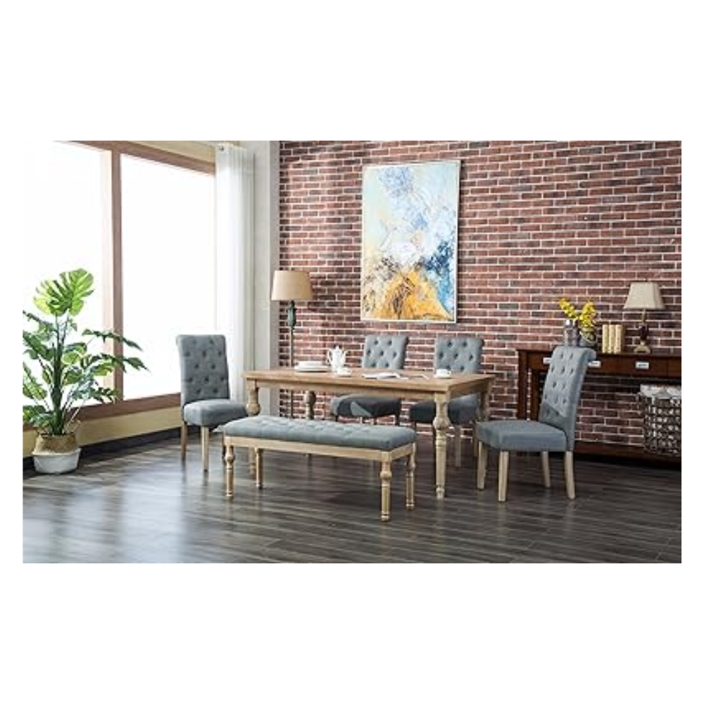 Set includes dining table, 4 chairs and 1 Bench. The dining chairs are upholstered in your choice of color Perfectly accented with button tufting