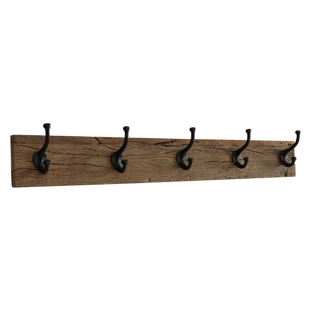 Crafted of reclaimed wood sourced from railway track beds and black iron double ball hooks.