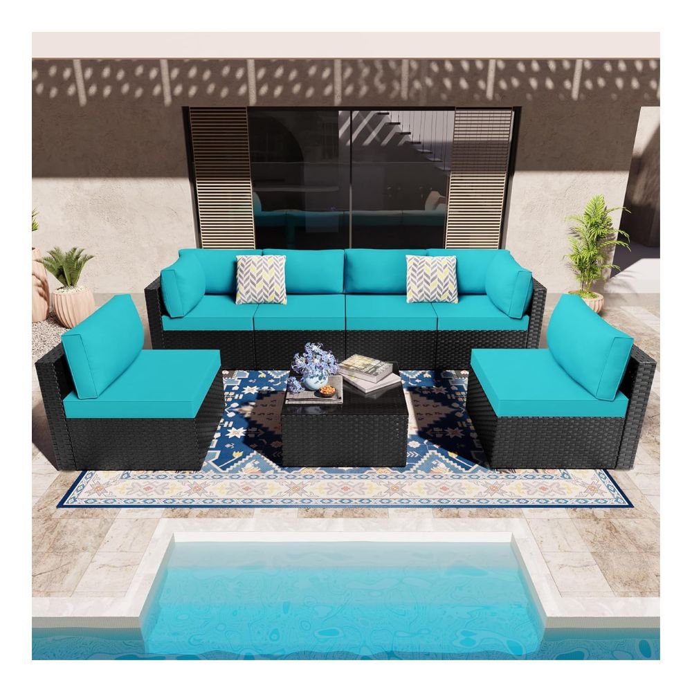 Walsunny Outdoor Black Rattan Sectional Sofa- Patio Wicker Furniture Set Conversation Sets with Tea Table&Washable Couch Cushions (Red)