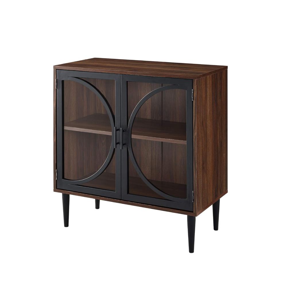 With distinct decorative door fronts of tempered glass and metal, this multifunctional accent console gives both storage space and a stylish addition to any room. Set near a wall in your living room as an accent console, in your kitchen as a storage cabinet for your fine china, or as a bar cabinet with your drinks and glassware, as the shelf is adjustable to fit your items. Held up with mid century modern tapered legs, this piece incorporates both an industrial chic look and transitional style for an on-trend element in your home.