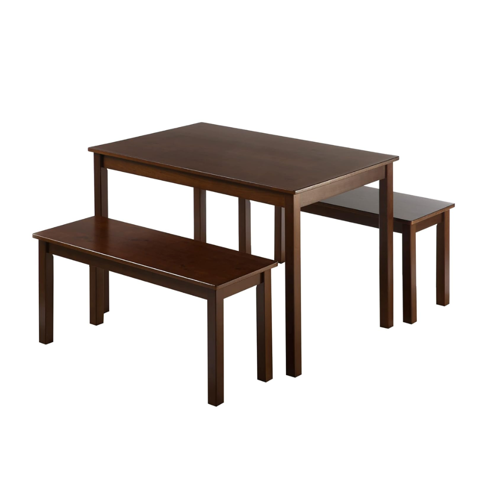 The zinus espresso wood dining table and benches, 3 piece set, will add classic charm to your kitchen. Easy to assemble in minutes with sturdy wood construction for durability and long lasting use. Worry free 1 year warranty.